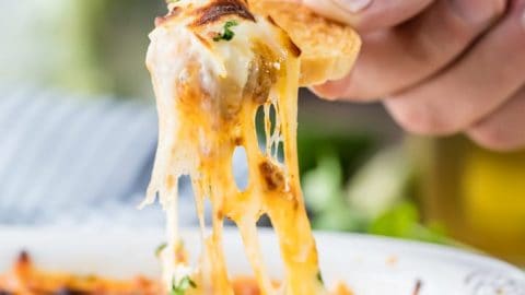But this dip goes well with any kind of chips or crackers, so serve it with whatever you have, or set out a variety of options. It’s also the perfect thing to serve with crostini! You could also try these homemade baked tortilla chips for another fun dipping option, or these crispy wonton chips!