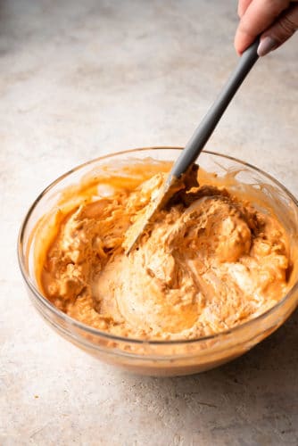 This oven baked buffalo chicken dip recipe is truly as easy as can be! As you can see from the step by step photos below, all you have to do is mix the ingredients, pour into a baking dish, and let it cook until it’s heated all the way through.