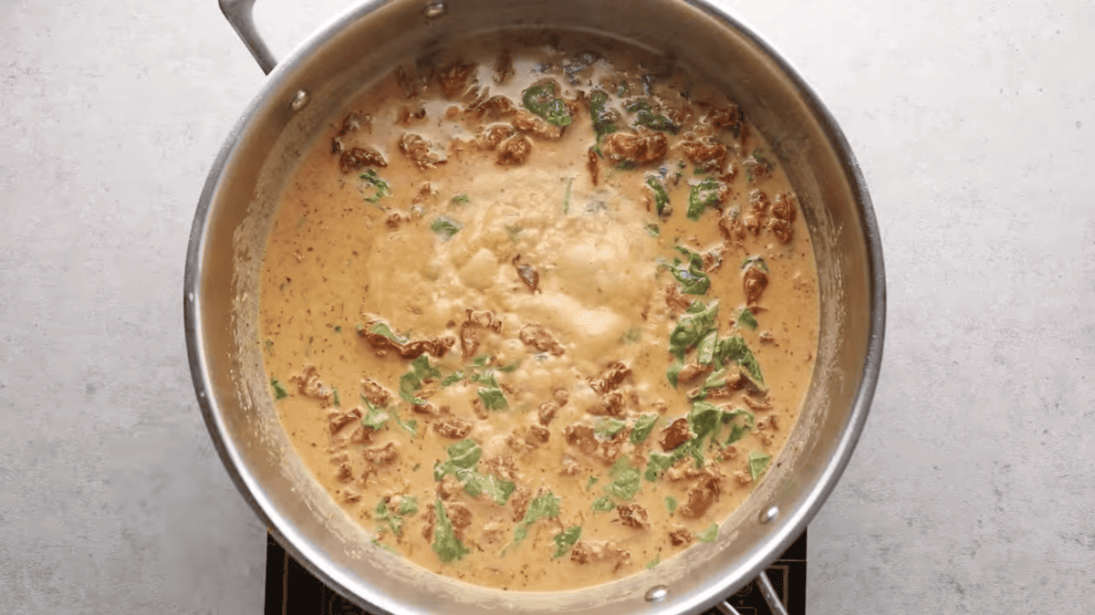 - Spinach goes in last. Add the spinach at the very end and stir just until wilted. This keeps it tender and prevents excess water from thinning the sauce.