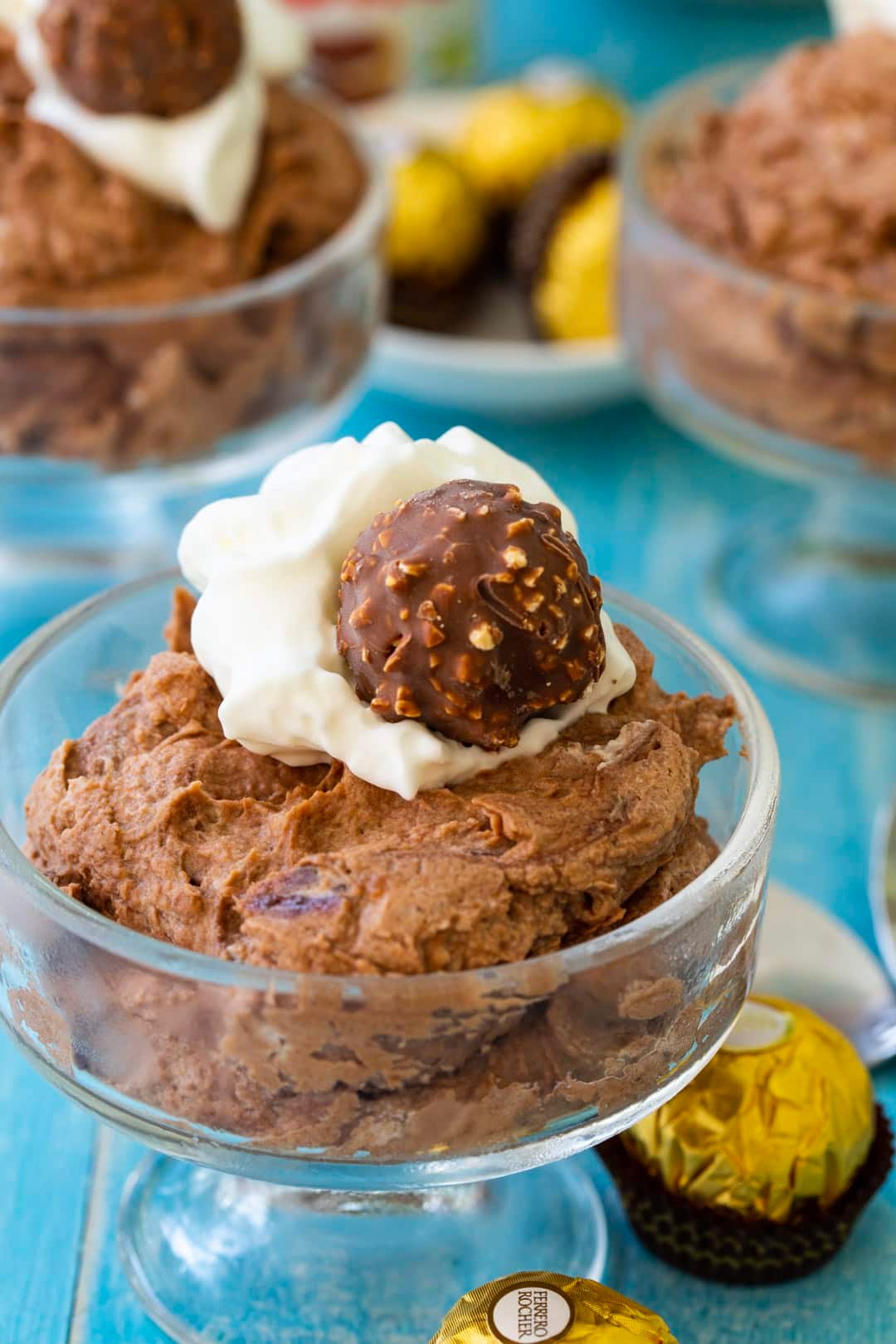 This is such a simple recipe. You only need heavy cream, sugar, mascarpone cheese, and Nutella to make the mousse. For serving I like to top it with a little Cool Whip and a Ferrero Rocher Chocolate but they are optional.
